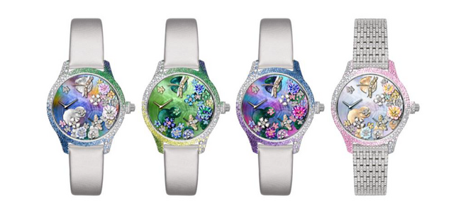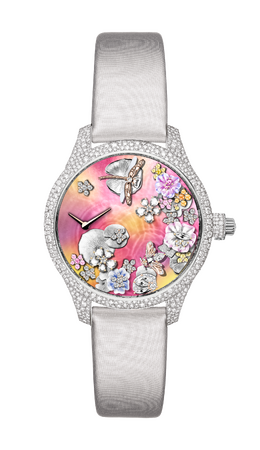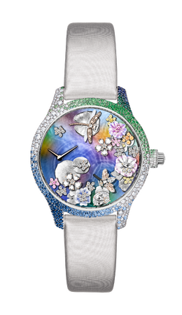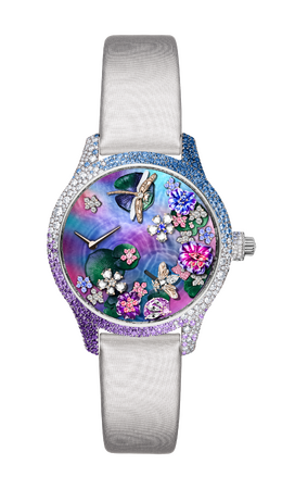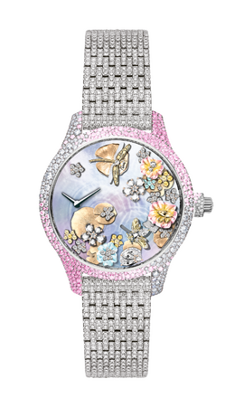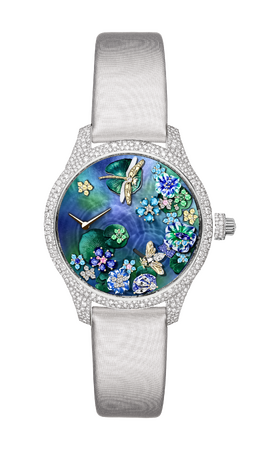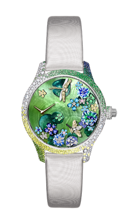 創設者 クリスチャン・ディオールの壮麗な庭園へのオマージュとして、新作「ディオール グラン ソワール オートマタ ミロワール ドー」が誕生しました。クリスチャン・ディオールが幼少期を過ごしたフランス、ノルマンディ地方のグランヴィルの館「リュンブ(Villa Les Rhumbs)」の庭園は、ムッシュ ディオールにとって、常に特別な場所であり続けました。「ディオール グラン ソワール オートマタ ミロワール ドー」は、この美しく保存されたエデンに敬意を表し、魅惑的な空間の優雅で洗練された世界観を表現します。機械式オートマタが作動するとミロワール ドー(水鏡)に命が吹き込まれ、詩的な物語が動きとともに繰り広げられます。片側では貴石で描かれた花びらが風に揺れ、蜜を求めて花の周りを蜂が舞います。もう片側では煌めく雌しべを配した花冠が揺らめき、睡蓮の花には金色の羽のトンボが舞い降り、さざ波の上をそよぎます。豊かな自然の夢想はダイアルに始まりケース全体へと広がり、水面の色合いと輝きを映し出すかのように、ダイヤモンドと宝石が惜しみなくあしらわれています。新作「ディオール グラン ソワール オートマタ ミロワール ドー」は全6型取り揃えます。