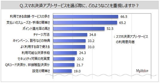 スマホ決済利用意向者に、選定時の重視点を聞いたところ(複数回答)、「利用できる店舗・サービスの多さ」「支払いのスムーズさ・手順の簡単さ」が各65%台、「ポイント還元率の高さ」が52.5%となっています。