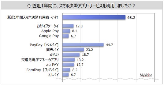 直近1年間にスマホ決済を利用した人は7割弱です(ネットショッピング含む)。