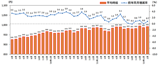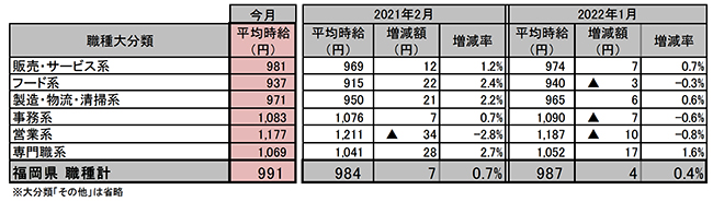 ■福岡県の平均時給は991円(前年同月984円、前月987円)