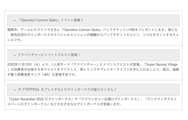 「Operation Cannon Spike」の実装を記念したイベントや、ログインボーナス、ソウルショップが充実するイベント「Cyber November 2022」を開催いたします。新カードセット「Operation Cannon Spike」が実装されたこの機会に、新カードを手に入れて、『TEPPEN』をお楽しみください。