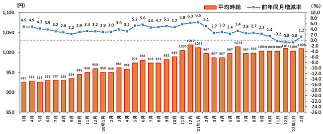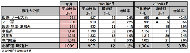 ■北海道の平均時給は1,009円(前年同月997円、前月1,004円)