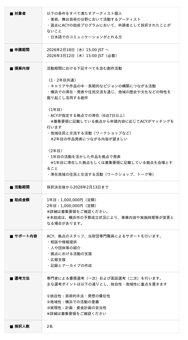 アーツコミッション・ヨコハマ(略称:ACY、運営:公益財団法人横浜市芸術文化振興財団)は、2026-2027年度「つながる創造:ACYアーティスト・フェローシップ助成」の公募を実施します。