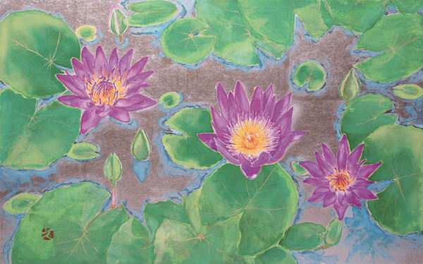 このたび、塚本氏より日本画家金子絵里先生に金箔が提供され、金子先生によって清新な日本画作品が制作されました。