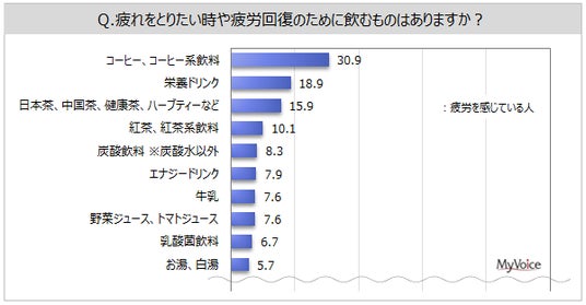 疲労を感じている人が疲労回復のために飲むものは(複数回答)、「コーヒー、コーヒー系飲料」が30.9%、「栄養ドリンク」「日本茶、中国茶、健康茶、ハーブティーなど」「紅茶、紅茶系飲料」が各10%台です。