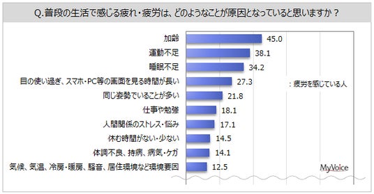 疲れ・疲労を感じる原因だと思うことは(複数回答)、「加齢」が疲労を感じている人の45.0%、「運動不足」「睡眠不足」が各30%台、「目の使い過ぎ、スマホ・PC等の画面を見る時間が長い」「同じ姿勢でいることが多い」が各20%台です。