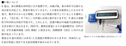 K値は魚の鮮度を科学的に示す指標であり、この客観的な評価は魚価向上につながるとともに、適