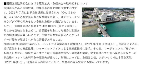 2025年12月から沖縄県国頭漁協※資料で獲れた魚を国内外へ試験輸送し、品質と輸送安全性、適正な取引価格に関する検証を重ねてまいりました。引き続き海外輸送を中心に検証を重ね、より多くの消費者の方のもとへお運びする仕組みを構築してまいります。