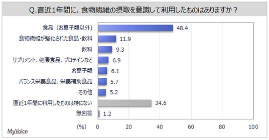直近1年間に食物繊維摂取のために利用したものは(複数回答)、「食品(お菓子類以外)」が48.4%、「食物繊維が強化された食品・飲料」が11.9%です。