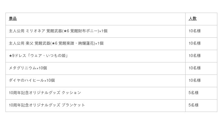 10周年を記念して、Twitterキャンペーンを前半、後半で実施します。前半は、抽選でゲーム内アイテムやオリジナルグッズをプレゼント。