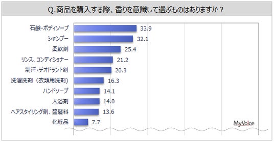 商品購入時に香りを意識して選ぶものは(複数回答)、「石鹸・ボディソープ」「シャンプー」が各3割強、「柔軟剤」「リンス、コンディショナー」「制汗・デオドラント剤」が各20%台です。