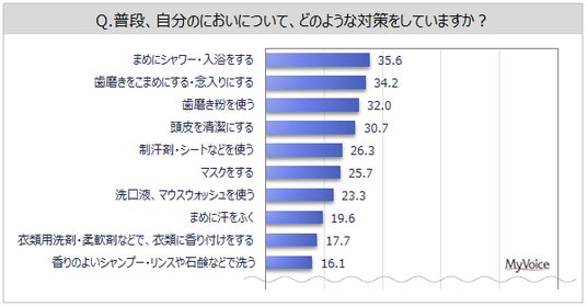 ■普段行っているにおい対策は、「まめにシャワー・入浴」「歯磨きをこまめに・念入りに」「歯磨き粉」「頭皮を清潔に」が各30%台。室内のにおい対策は、「換気」が4割弱、「消臭剤」「消臭・芳香剤」が各20%台