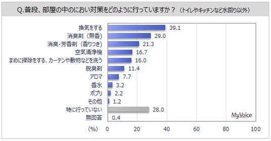 行っている対策は(複数回答)、「換気をする」が39.1%、「消臭剤(無香)」「消臭・芳香剤(香りつき)」が各20%台、「空気清浄機」「まめに掃除をする、カーテンや敷物などを洗う」が16~17%です。