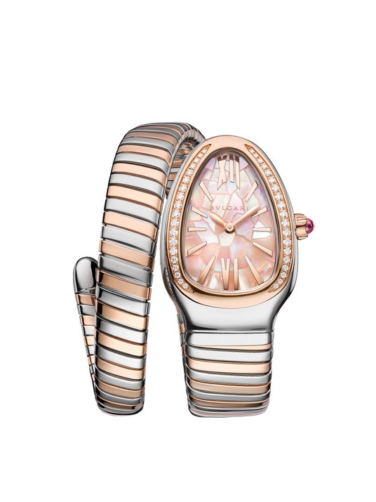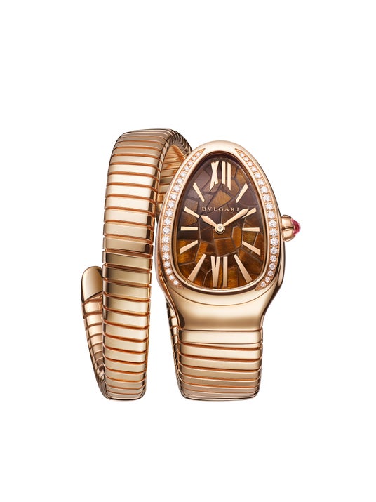 「セルペンティ トゥボガス」における初の芸術的コラボレーションは日本の建築家 安藤忠雄氏が大切にしてきたテーマである自然が見せるはかなき美しさを讃えます。グリーンアベンチュリン、タイガーアイ、ホワイトそしてピンクのマザーオブパールにより、ブルガリのアイコンであるセルペンティのダイヤルに季節ごとに変化する森の色合いがもたらされます。