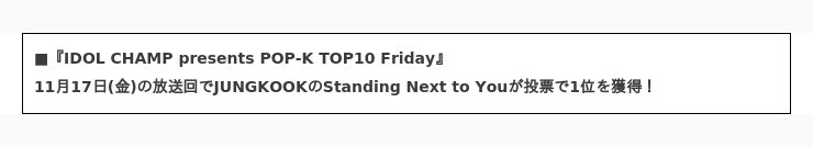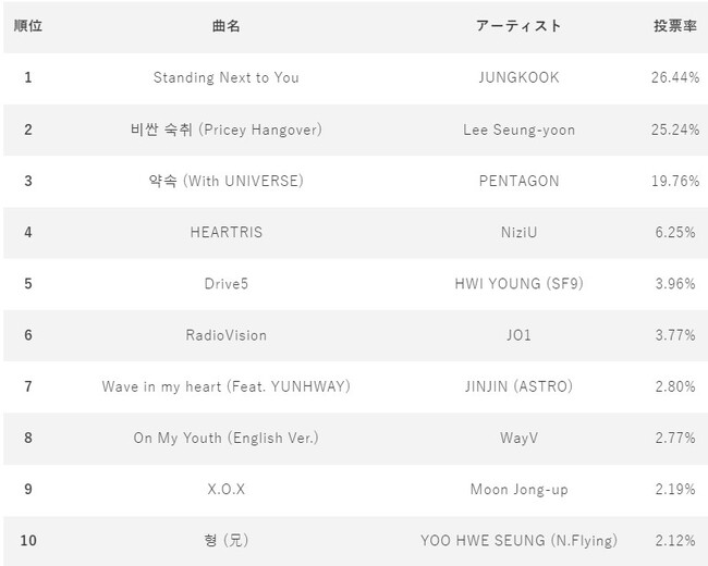 『IDOL CHAMP presents POP-K TOP10 Friday11月17日(金)の放送回において、JUNGKOOKのStanding Next to Youが、チャート投票で1位を獲得し、今週のNo.1曲として番組内で放送されました。