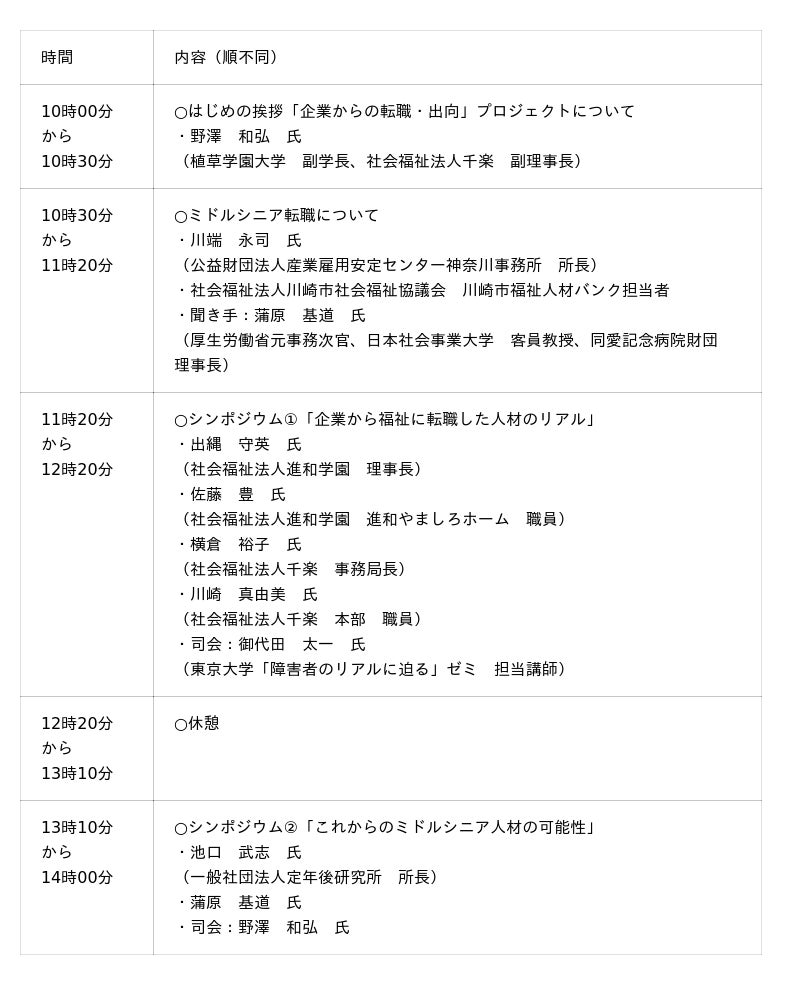 一般企業で長く働いてきたミドルシニア層が、それまでの経験を活かし、障害福祉現場で活躍する事例が増えています。県では、障害福祉現場の人手不足を解消するために、障害福祉事業者への訪問、圏域説明会の開催等を通して、ミドルシニア層の障害福祉分野への移転促進を目指しています。本プロジェクトの1年間の取組を踏まえたフォーラムを2月に開催しますので、お知らせします。