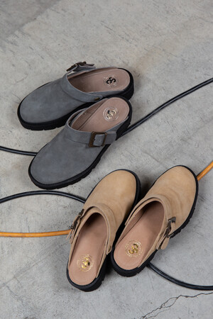 COMMENT: "アップデートしたSUEDELUGMULE。 今回は金具にアンティークシルバーの加工を施し、特別に用意し たカラーでのJOURNAL STANDARD 別注仕様。ベルトは装 飾としてだけでなく、返せば踵に引っ掛けて履くことができるよう、 フィット感、履き心地、動きやすさを向上させられる仕様に変更。 ソールは今回からEXTRALIHGTを採用し軽量化。踵のフレーム 部分も取り除き、スリッパー型にすることで更に日常生活に馴染 む""NEWSTANDARD""な一足に。"
