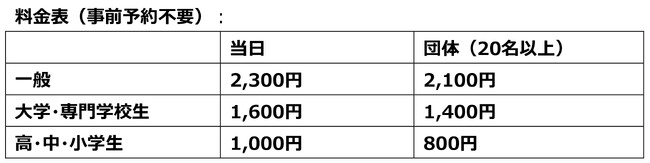 ※未就学児は無料(高校生以上の付き添いが必要)/※団体券は会場の当日券窓口のみ販売/※障がい者手帳をお持ちの方と介助者1名は無料/※学生、各種お手帳をお持ちの方は、証明できるものをご提示ください/※一度購入されたチケットの券種変更、払い戻し、再発行はいたしません