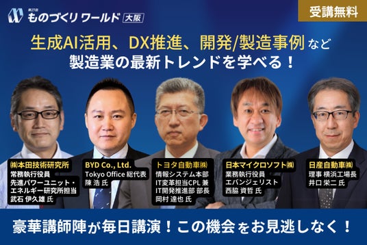 トヨタ自動車/本田技術研究所/日産自動車/マツダ/BYD/ヤマハ発動機/パナソニック ホールディングス/デンソー/日本マイクロソフト等が登壇! 製造業の生成AI活用・DX推進をはじめ、開発・製造事例について先進企業の取組みを詳しく学べます。更に「カーボンニュートラル」「AM技術の真の普及に向けた取り組み」「EMS戦略」ほか、海外企業の最新動向など、課題に合わせて学べる講演多数!製造業の最新トレンドを学べるまたとない機会をお見逃しなく!