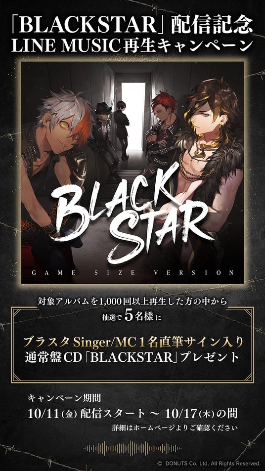 株式会社DONUTS(東京都渋谷区、代表取締役:西村啓成)が運営するスマートフォン向けアプリゲーム『ブラックスター -Theater Starless-』(以下、ブラスタ)は、1stアルバム「BLACKSTAR」に収録されている楽曲のゲームサイズ版のストリーミング配信を、各種配信サイトにて本日より開始いたしました。