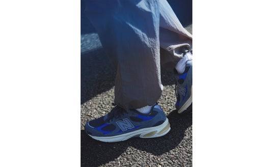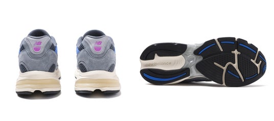 今回のモデルは、ニューバランスを象徴するレトロランニングシューズのシルエットを踏襲。ダークグレーのスエードとメッシュをベースに、ロイヤルブルーのパネルを配し、タンにはピンクからパープルへと移ろうグラデーションカラーを採用しています。控えめな洗練さの中に鮮やかな生命感を宿し、長年の友情の中で共有されてきた記憶や、言葉にしなくても通じ合う関係性を表現しています。