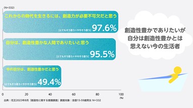 これからの時代「創造力が必要不可欠」と9割が回答するも、自身が「創造性豊か」だと自覚している人が5割にとどまる。