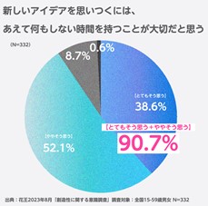 「新しいアイディアを思いつくには、あえて何もしない時間を持つことが大切だと思う」ことについては、「とてもそう思う」が38.6%、「ややそう思う」が52.1%でした。