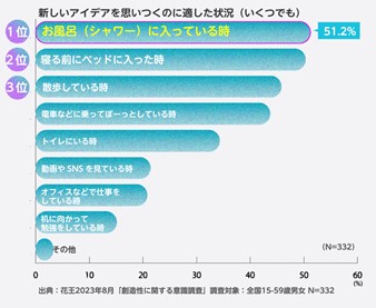 日常生活の中で、新しいアイディアを思いつくのに適した状況を聞いたところ、「お風呂(シャワー)に入っている時」が5割を超えてトップであり、次いで「寝る前」「散歩」でした。一方、「勉強をしている時」や、「仕事をしている時」、「動画やSNSを見ている時」は、新しいアイディアを思いつくことが少ないようです。