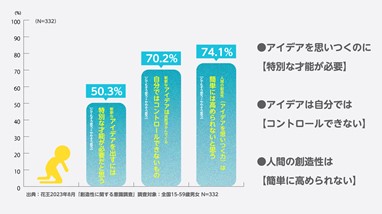 新しいアイディアを思いつくには、特別な才能が必要だと思う人が5割で、7割が人間の創造性は簡単に高められないと感じている。