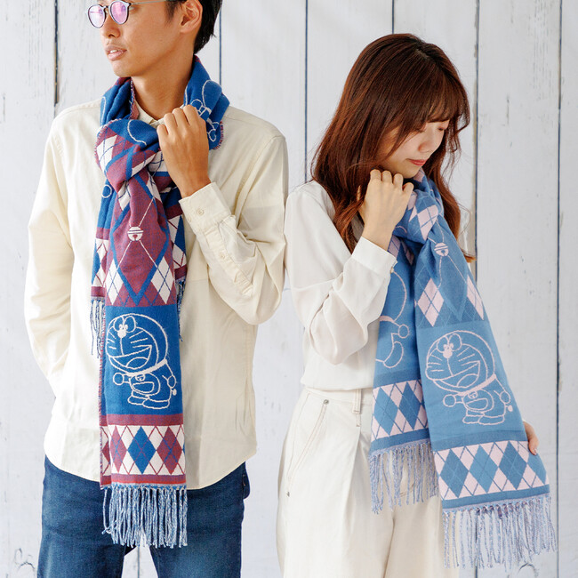 冬のストールやマフラーの定番のアーガイル柄に、ドラえもんのアートや鈴のアイコンを取り入れた、ドラえもん未来デパート限定のストールです。長さ180cmと大判サイズで木製のボタン付きのため、マフラーとしてはもちろん、ボタンを留めてポンチョのように羽織ったり、ひざ掛けとしても重宝します。ユニセックスで着用しやすい、ボルドー×ネイビーとブルー×ピンクの2つのカラー展開です。肌寒くなるこれからの季節のアウターに取り入れてみてはいかがでしょうか。