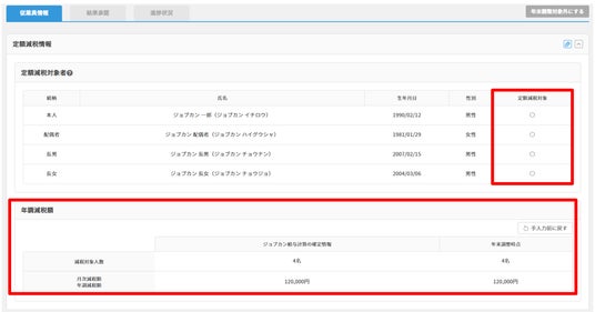 「ジョブカン年末調整」では、従業員へのアンケートで対象者の自動判定と減税額の自動計算をすることができます。自動判定で対応出来ない場合などは対象人数を修正する(手入力もしくはCSV登録)ことが可能です。