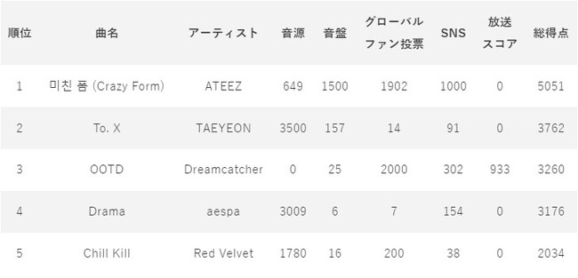 (※)各スコアの割合音源35%、音盤15%、グローバルファン投票(アプリ)20%、SNS10%、