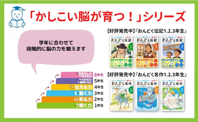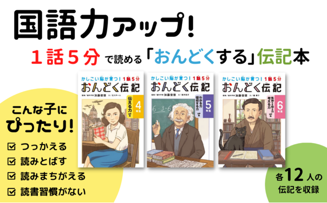 世界文化社は、 小学生でも集中力を切らさない5分単位で、すべての学習の基盤となる "読む力" を伸ばす「かしこい脳が育つ!1話5分 おんどく」シリーズ第3弾、初の小学校高学年向けとなる『1話5分 おんどく伝記 4年生』『同 5年生』『同 6年生』を2023年2月15日(水)に発売しました。話題の脳科学者・加藤俊徳先生監修。