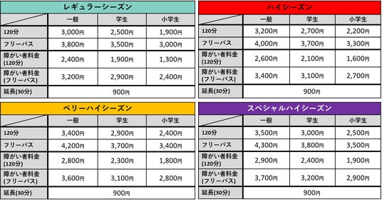 VS PARKは4種類の料金パターン(レギュラーシーズン料金・ハイシーズン料金・ベリーハイシーズン料金・スペシャルハイシーズン料金)で運営します。日別に料金パターンを設定していますので、来店前にVS PARK各店舗公式サイトの「料金カレンダー」をご覧いただき、利用日当日の料金をお確かめください。