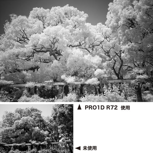 R72を使用することで、肉眼と異なる明暗の赤外線写真を楽しむことができます。赤外撮影では露出の調整が大変難しいものですが、デジタルカメラなら撮影画像を確認して露出を調節し、その場での再撮影が可能です。カメラのメーカーや機種により、赤外の感光特性が異なるため、露出の調整など、実際に撮りながらコツをつかむ必要はありますが、より多くの方に赤外線写真を楽しんでいただけるフィルターです。