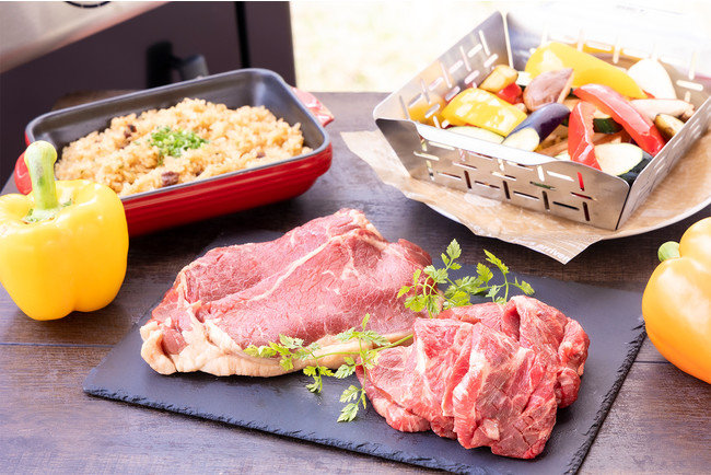 【メニュー内容】サーロイン(おとな100g・こども70g)、ミスジ(おとな100g・こども70g)、ベジタブル&きのこBOX、メープルガーリックライス