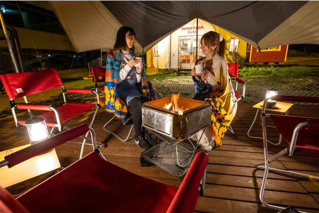 スタッフが管理する共用たき火。オープンスタイルのデッキでおひとりから参加可能です。