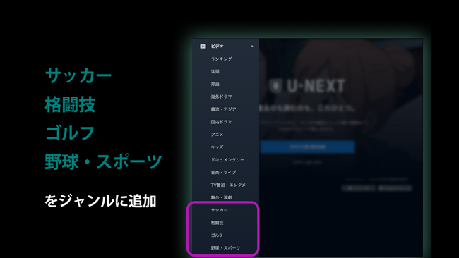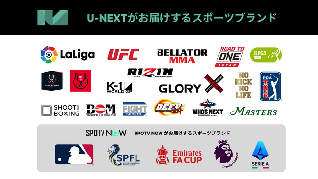 USEN-NEXT GROUPの株式会社U-NEXT(本社:東京都品川区、代表取締役社長:堤 天心)が運営する動画配信サービス「U-NEXT」は、スポーツコンテンツの拡充に伴い、6月26日(月)より、スポーツジャンルを「サッカー」「格闘技」「ゴルフ」「野球・スポーツ」の4ジャンルに分割し、サービス内で独立して表示開始いたしました。ユーザーが目的のスポーツや大会を探しやすくするとともに、映画、ドラマ、アニメなどと並ぶジャンルとして各競技を独立させることで、スポーツジャンルに今後も注力していくことを宣言いたします。