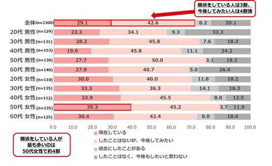 1.現在腸活をしている人は3割で、したことはないが今後してみたい人は4割強。腸活をしている人が最も多いのは50代女性で4割。