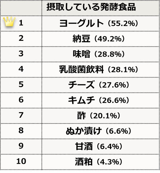 また、「腸活」として尋ねると、現在している人は3割でしたが、腸活や健康を意識して摂取している発酵食品を尋ねると「ヨーグルト」「納豆」は5割前後で、腸活をしている人の割合より高くなりました。意識していなくても、自然に腸活をしている方もいらっしゃるようです。