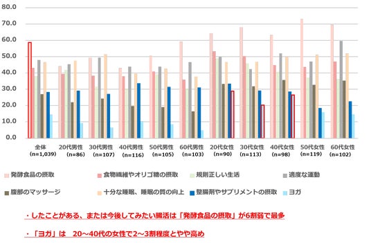 2.したことがある、または今後してみたい腸活は、「発酵食品の摂取」が6割弱で最多。以下「適度な運動」「十分な睡眠、睡眠の質の向上」「食物繊維やオリゴ糖の摂取」が4割台で上位。「ヨガ」は20~40代の女性で2~3割程度とやや高め。