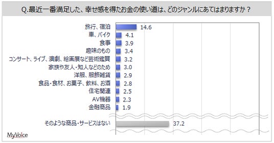 満足感を得た消費行動がある人は6割です。「旅行、宿泊」が14.6%、「車、バイク」「食事」が各4%となっています。
