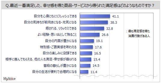 最も満足した消費行動から得た満足感の内容は(複数回答)、「自分を心身ともにリフレッシュできる」「自分の気持ちが前向きになる・元気になる」が4割前後、「癒される、リラックスできる」が32.8%です。