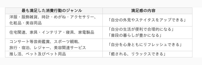 最も満足した消費行動のジャンル別にみると、下記のような満足感が高くなっています。