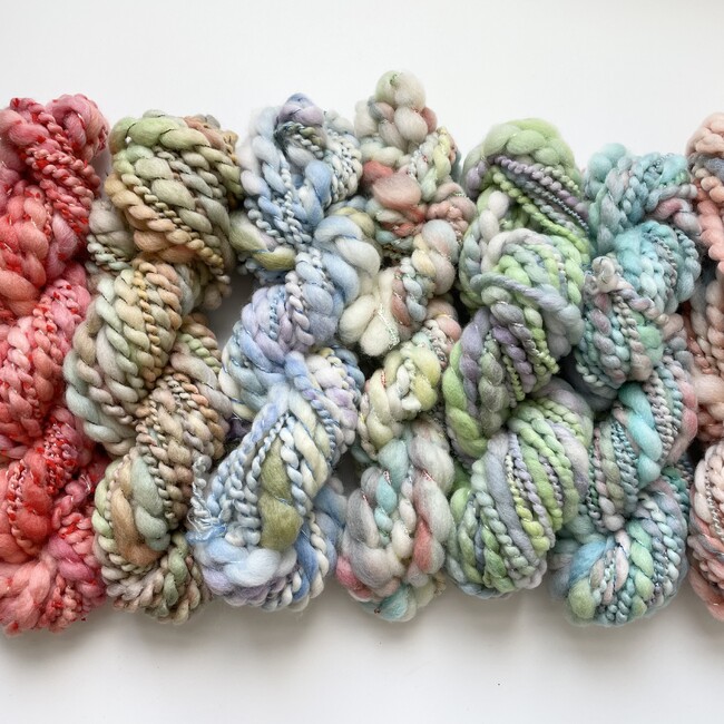 1本1本、愛情を込めて紡がれた糸は、どれも個性豊かな1点物。おすすめは、ぽこぽこが可愛いアートヤーン。ラメ糸をプラスした上品でおしゃれな毛糸もご用意します。