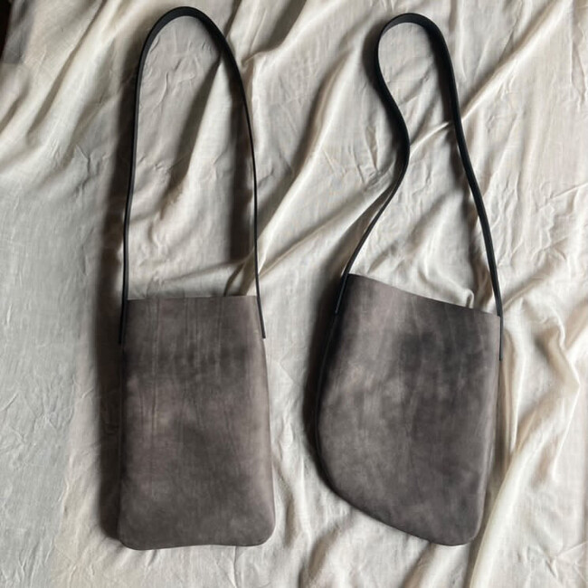 仕立てにこだわって作られた「革袋」と、柔らかで繊細なピッグスエード製の「革花」アクセサリーが並びます。