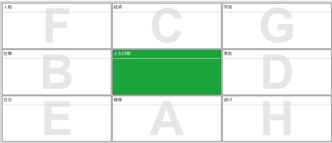 SELFingシートには「人生目標」(人生を通した目標設定)と「3年後の自分」(短期の目標設定)の2種類があり、「人生目標」シートは、真ん中に「人生目標」、周囲8マスには人生を構成する8大分野「健康」「仕事」「経済」「家庭」「社会」「人格」「学習」「遊び」が設定されています。「3年後の自分」シートは、主に人生目標シートの「仕事」で設定した目標から発展させて作成します。