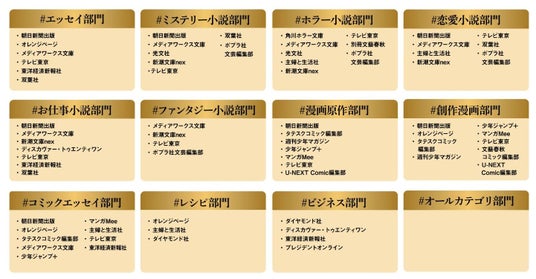 朝日新聞出版、オレンジページ、角川ホラー文庫(KADOKAWA)、タテスクコミック編集部(KADOKAWA)、メディアワークス文庫(KADOKAWA)、光文社、週刊少年マガジン(講談社)、少年ジャンプ+(集英社)、マンガMee(集英社)、主婦と生活社、新潮文庫nex(新潮社)、ダイヤモンド社、ディスカヴァー・トゥエンティワン、テレビ東京 、東洋経済新報社、双葉社、文藝春秋コミック編集部(文藝春秋)、別冊文藝春秋(文藝春秋)、プレジデントオンライン(プレジデント社)、ポプラ社文芸編集部(ポプラ社)、U-NEXT Comic編集部(U-NEXT)