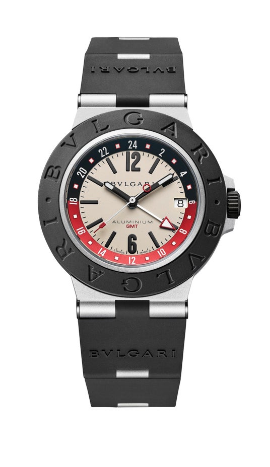 1998年誕生の「ブルガリ アルミニウム」は、斬新な素材のコンビネーションとオフホワイトのダイヤルにブラックのカウンターを配したグラフィカルかつ対照的なデザインで、大胆なステートメントを打ち出しました。2020年には斬新な素材とデザインのユニークな融合はそのままに、新たなピースが発表されました。航空宇宙産業でも採用されているアルミニウム合金6082と耐久性の高さで知られるFKMラバーを用い、最高基準の技術によって創り上げられたウォッチです。また2021年にはGMT機能を搭載し、旅行での使用という新たな一面が加わりました。ブルーでカラーリングされたこのタイムピースはデュアルタイムゾーン機能により世界中を旅する人たちの目を捉えました。この機能は、発表の1998年に、「ブルガリ アルミニウム」のイメージがアリタリア-イタリア航空のボーイング747の大陸横断便の機体を飾ったことへのオマージュでもあります。「ブルガリ アルミニウム ブラック GMT」は、ブラックのベゼルおよびラバーストラップとホワイトダイヤルのコントラストが特徴です。GMT機能は日中の時刻をレッド、夜の時刻をブラックに色分けすることで直感的に時刻の読み取りがしやすくなっています。第二時間帯は、赤く縁取られた白い矢印によって指し示されます。針とマーカーにスーパールミノバ(R)が塗布され、暗い場所でも優れた視認性を発揮するユーザーフレンドリーなデザインです。ローカルタイムと第二時間帯をリューズを使って簡単に設定することができます。さらに3時位置に日付表示がさりげなく配置されています。「ブルガリ アルミニウム ブラック GMT」は絶妙なデザインと機能性により、世界を旅し洗練された感覚を持つ人たちの心を捉えます。