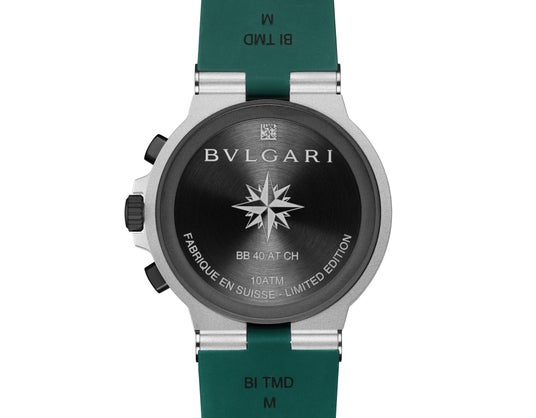 「ブルガリ アルミニウム エメラルド 限定モデル」の心臓部で時を刻むのは、クロノグラフおよび日付表示機能を備えた自動巻きムーブメントB130です。直感的にも操作がしやすいスタート・ストップボタンとリセットボタンを備え、精度の高い計時を可能にしています。チタン製ケースバックには細やかな羅針図のエングレービングが施されています。イタリアの夏のエッセンスを凝縮したこのエクスクルーシブなウォッチは、きらめく海の深いグリーンをイメージさせるスペシャルボックスにて展開されます。